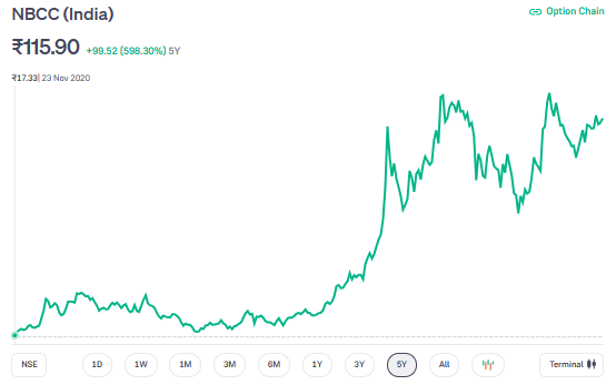 तीसरा स्टॉक National Buildings Construction Corporation Limited (NBCC) है, जिसने पांच सालों में 598.3 प्रतिशत का शानदार रिटर्न दिया है. पहले जहां इसका शेयर 17.23 रुपये था. वहीं मंगलवार को दोपहर 1 बजे यह 116 रुपये के आसपास ट्रेड कर रहा था. NBCC ने भी 13 नवंबर को अपने शेयरधारकों के लिए 0.21 रुपये प्रति शेयर का अंतरिम डिविडेंड घोषित किया है. इस घोषणा के बाद यह स्टॉक भी 19 नवंबर को एक्स-डिविडेंड ट्रेड करेगा.