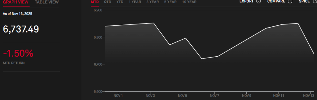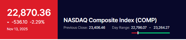 S&P 500 इंडेक्स 1.66 फीसदी गिरकर 6,737.49 पर बंद हुआ. Nasdaq 2.29 फीसदी गिरकर 22,870.36 पर पहुंचा. Dow Jones इंडस्ट्रियल एवरेज 1.65 फीसदी गिरकर 47,457.22 पर बंद हुआ. यह एक महीने में सबसे तेज एक दिन की गिरावट थी.