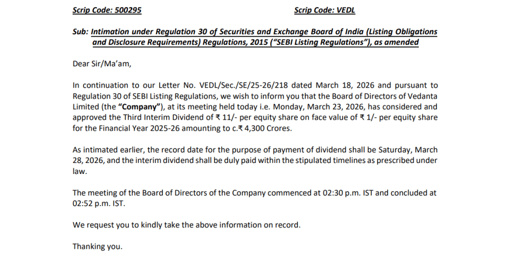 बाजार में इन दिनों भारी बिकवाली देखने को मिल रही है. इससे इतर Vedanta Ltd ने अपने निवेशकों को एक बार फिर खुश कर दिया है. कंपनी के बोर्ड ने 23 मार्च 2026 को हुई बैठक में वित्त वर्ष 2025-26 के लिए तीसरा इंटरिम डिविडेंड घोषित किया है. कंपनी ने प्रति इक्विटी शेयर 11 रुपये का डिविडेंड देने का ऐलान किया है. इस डिविडेंड के जरिए कुल लगभग 4300 करोड़ रुपये निवेशकों में बांटे जाएंगे. कंपनी ने डिविडेंड के लिए रिकॉर्ड डेट 28 मार्च 2026 तय की है, जबकि भुगतान तय समयसीमा के भीतर किया जाएगा.