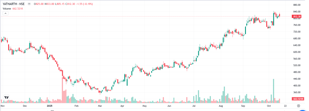 बुधवार को बाजार हरे निशान में बंद हुआ, जहां सेंसेक्स और निफ्टी-50 दोनों ही 0.70 प्रतिशत ऊपर रहे. हालांकि, Yatharth Hospital का शेयर मामूली गिरावट के साथ 0.1 प्रतिशत टूटकर 812.30 रुपये पर बंद हुआ. इंट्राडे के दौरान यह शेयर 831.55 रुपये के हाई तक गया जबकि 813.05 रुपये का लो बनाया. इसका 52-सप्ताह के हाई 843 रुपये और लो 345.35 रुपये है. इस हिसाब से, शेयर ने अपने 52-सप्ताह के निचले स्तर से 135 प्रतिशत का जबरदस्त रिटर्न दिया है.