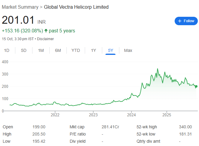 Global Vectra Helicorp Ltd नाम शायद ज्यादा चर्चित न हो, लेकिन इस स्टॉक पर अब दिग्गज निवेशक विजय केडिया की नजर है. मार्केट में ये शेयर बुधवार को 2.43% उछलकर 201.10 रुपये पर पहुंच गया. हालांकि, यह अब भी 52-वीक हाई 344.70 रुपये की तुलना में अच्छे डिस्काउंट पर मिल रहा है. पिछले 5 साल में इस स्टॉक ने 320% का रिटर्न दिया है.