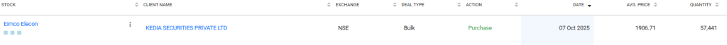 कमजोर नतीजों के बावजूद मशहूर निवेशक डॉ. विजय केडिया की फर्म Kedia Securities Pvt Ltd ने हाल ही में Eimco Elecon में नई हिस्सेदारी खरीदी है. कंपनी ने 57,441 शेयर 1,906.71 रुपये प्रति शेयर के भाव पर खरीदे हैं. यानी कुल निवेश लगभग 10.95 करोड़ रुपये का हुआ.