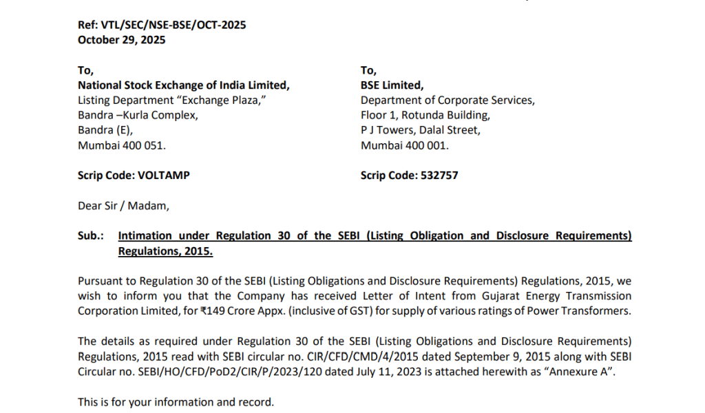 Voltamp Transformers: ट्रांसफार्मर बनाने वाली दिग्गज कंपनी Voltamp Transformers Ltd को Gujarat Energy Transmission Corporation Ltd (GETCO) से लगभग 149 करोड़ रुपये (GST सहित) का बड़ा ऑर्डर मिला है. यह ऑर्डर कंपनी को Letter of Intent (LOI) के जरिए मिला है, जिसमें विभिन्न क्षमता के Power Transformers के डिजाइन, निर्माण, टेस्टिंग और सप्लाई का काम शामिल है. इस कॉन्ट्रैक्ट को छह महीने की अवधि में पूरा करना है और यह गुजरात के बिजली ट्रांसमिशन नेटवर्क को मजबूत बनाने में अहम भूमिका निभाएगा. कंपनी के शेयरों ने निवेशकों को मल्टीबैगर रिटर्न दिया है. हालांकि ये शेयर अभी अपने एक साल के हाई से 40 फीसदी डिस्काउंट पर कामकाज कर रहा है.