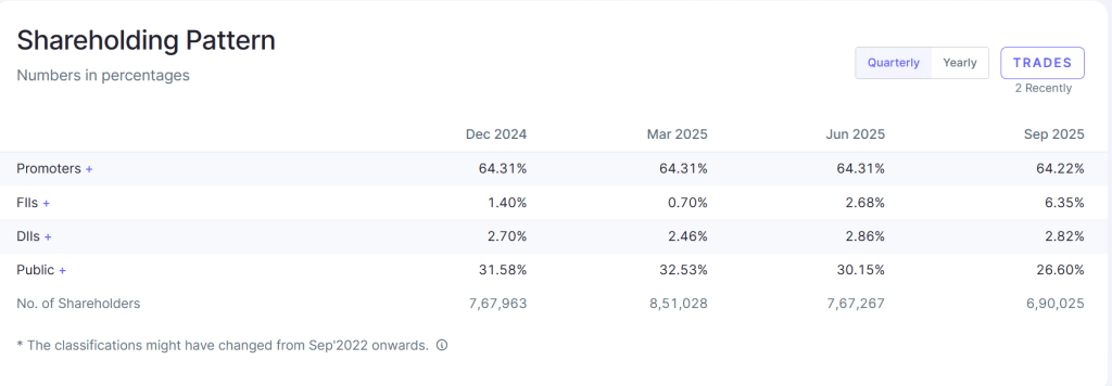 हालिया शेयरहोल्डिंग पैटर्न के मुताबिक, विदेशी संस्थागत निवेशकों (FII) ने कंपनी में हिस्सेदारी में काफी बढ़ोतरी की है. Q2FY26 में FII का हिस्सा 2.68 फीसदी से बढ़कर 6.35 फीसदी हो गया, यानी तकरीबन 136 फीसदी की वृद्धि. कंपनी में रिटेल निवेशकों का हिस्सा 26.60 फीसदी, डोमेस्टिक इंस्टीट्यूशंस 2.82 फीसदी और प्रमोटर्स के पास 64.22 फीसदी हिस्सेदारी है. FII निवेश में यह तेजी यह दर्शाती है कि विदेशी निवेशकों का भरोसा बढ़ रहा है, वहीं प्रमोटर्स और घरेलू निवेशकों की मजबूत हिस्सेदारी कंपनी की स्थिरता को भी सुनिश्चित करती है.