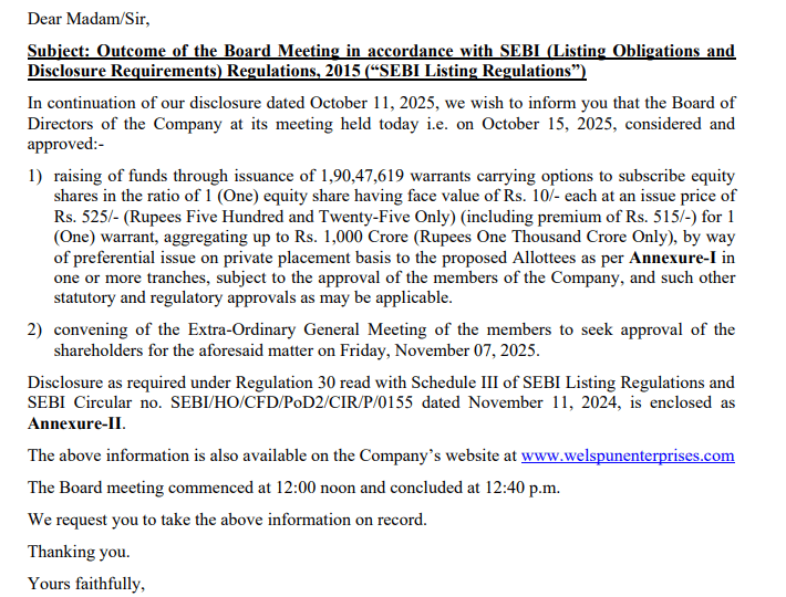 वेलस्पन एंटरप्राइजेज लिमिटेड ने 1,90,47,619 वारंट जारी करके पैसे जुटाने का ऐलान किया. हर वारंट से 1 इक्विटी शेयर मिलेगा, जिसका फेस वैल्यू 10 रुपये है और इश्यू प्राइस 525 रुपये है. कंपनी कुल 1,000 करोड़ रुपये जुटाएगी. यह प्रेफरेंशियल इश्यू प्राइवेट प्लेसमेंट पर होगा. इसके लिए कंपनी के सदस्यों की मंजूरी जरूरी है. 7 नवंबर 2025 को शेयरधारकों की मंजूरी के लिए एक्स्ट्रा-ऑर्डिनरी जनरल मीटिंग होगी. कुल वारंट में से 71,23,809 प्रमोटर को मिलेंगे. बाकी 62.57 फीसदी नॉन-प्रमोटर पब्लिक को मिलेंगे.