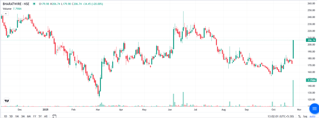 Bharat Wire Ropes Share Price: सोमवार, 27 अक्टूबर को एक तरफ जहां बाजार शानदार रैली कर रहा था. वहीं दूसरी तरफ Bharat Wire Ropes Ltd के शेयरों में जबरदस्त तेजी देखने को मिली. इस दौरान कंपनी के शेयर 20 प्रतिशत के अपर सर्किट पर लॉक हो गए. फरवरी 2020 के बाद यह पहली बार है जब स्टॉक में इतनी बड़ी उछाल दर्ज की गई है. शेयर अपने एक साल के निचले स्तर से 69 फीसदी से ज्यादा चढ़ चुका है. आइए इस बड़े उछाल के पीछे की वजह जानते हैं.