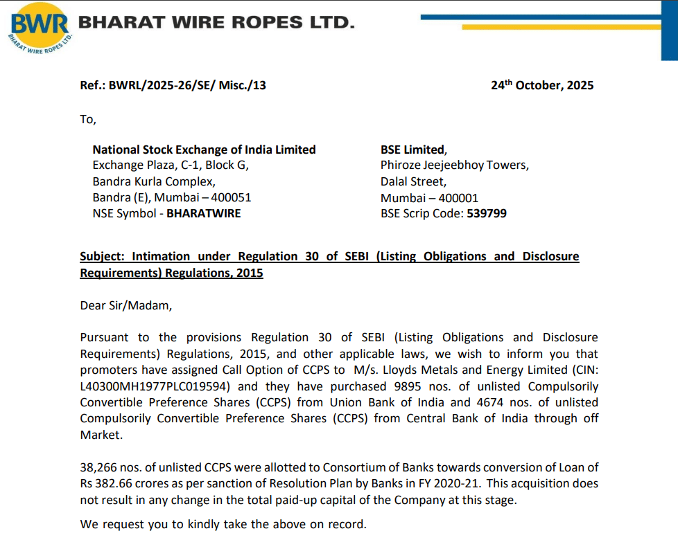 कंपनी ने एक्सचेंज फाइलिंग में बताया कि उसने Compulsorily Convertible Preference Shares (CCPS) का एक कॉल ऑप्शन Lloyds Metals and Energy Ltd को असाइन किया है. इसके बाद Bharat Wire Ropes ने कुछ CCPS एक लेंडर कंसोर्टियम से खरीदे हैं.