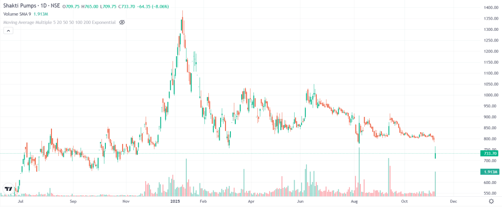 Shakti Pumps (India) Share Price: सोमवार के कारोबार में शक्ति पंप्स (इंडिया) के शेयरों में भारी गिरावट देखने को मिली. कंपनी का शेयर लगभग 9.80 फीसदी फिसलकर 720 रुपये के इंट्राडे लो तक पहुंच गया, जो इसका 52 हफ्तों का सबसे निचला स्तर है. पिछले सत्र में यह शेयर 797.95 रुपये पर बंद हुआ था. इसके साथ ही बीएसई पर इस शेयर में वॉल्यूम में चार गुना से अधिक उछाल देखा गया. हालांकि, इस शेयर ने अपने निवेशकों को बीते 5 साल में 1800 फीसदी से ज्यादा का रिटर्न दिया है. अब सवाल ये है कि ऐसा क्या हुआ कि ये मल्टीबैगर शेयर अपने एक साल के निचले स्तर पर आ गया?