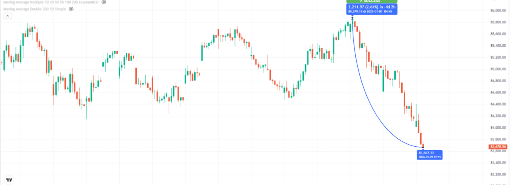 भारतीय शेयर बाजार में गिरावट का सिलसिला लगातार पांचवें दिन भी जारी रहा. शुक्रवार 9 जनवरी को सेंसेक्स और निफ्टी दोनों में जोरदार बिकवाली देखने को मिली. विदेशी निवेशकों की लगातार बिकवाली, जियो-पॉलिटिकल टेंशन और तिमाही नतीजों से पहले निवेशकों की सतर्कता ने बाजार के सेंटीमेंट को कमजोर किया है. कारोबार के दौरान सेंसेक्स करीब 500 अंक यानी 0.50 प्रतिशत से ज्यादा टूटकर 83,707.98 के निचले स्तर तक पहुंच गया. वहीं निफ्टी 50 भी आधे प्रतिशत से ज्यादा गिरकर 25,735.15 के इंट्राडे लो पर आ गया.