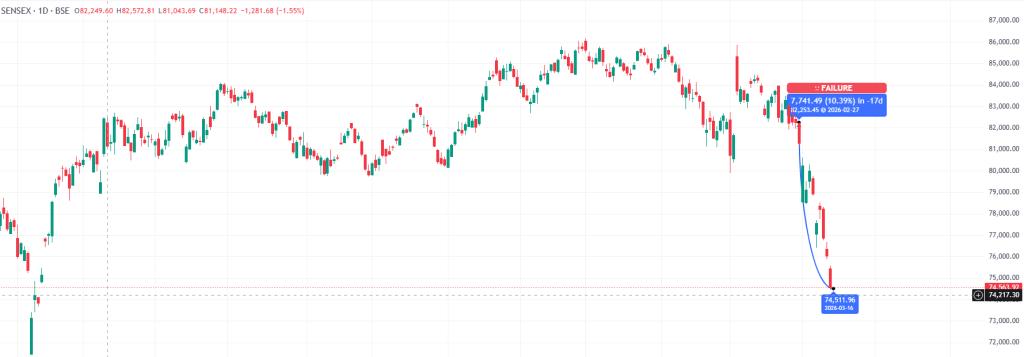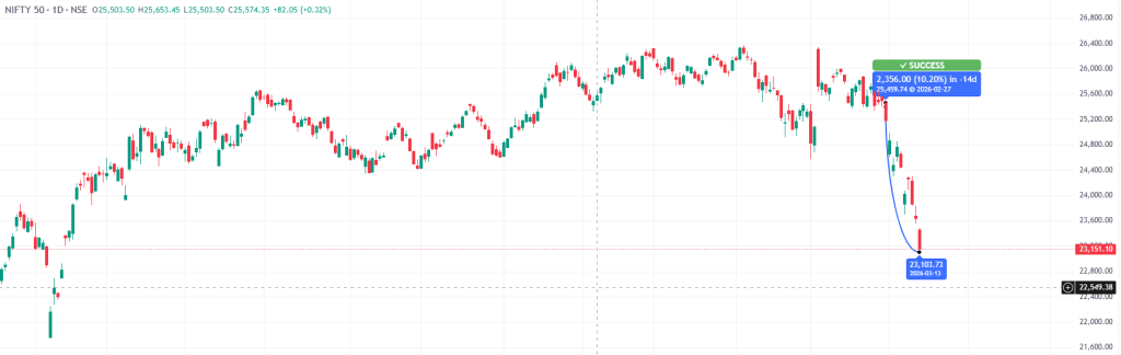 पिछले दो हफ्तों में Nifty 50 में भारी गिरावट आई है. यह इंडेक्स 25,496 के स्तर से गिरकर 23,151 तक पहुंच गया, यानी करीब 9.20 प्रतिशत की गिरावट दर्ज की गई. इसी तरह BSE Sensex भी 82,248 से फिसलकर 74,563 के स्तर तक आ गया. इस दौरान सेंसेक्स में करीब 7,685 अंक यानी 9.35 प्रतिशत की गिरावट दर्ज हुई.