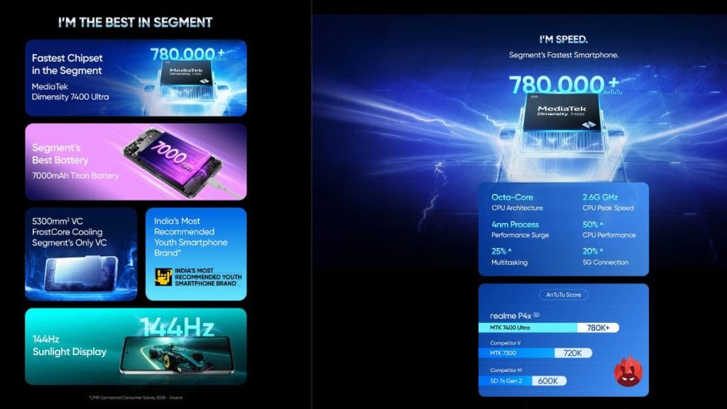 Realme P4x 5G में MediaTek Dimensity 7400 Ultra चिपसेट दिया गया है, जो 6nm प्रोसेस पर तैयार हुआ है. फोन में अधिकतम 8GB RAM और 256GB इंटरनल स्टोरेज मिलता है, जिसे 2TB तक माइक्रोSD कार्ड से बढ़ाया जा सकता है. इसके अलावा फोन 18GB तक वर्चुअल RAM सपोर्ट करता है, जिससे मल्टीटास्किंग और भी स्मूथ हो जाती है.