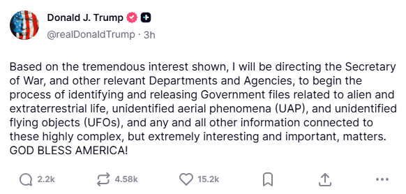 डोनाल्ड ट्रंप ने कहा कि सरकार को एलियंस, UFO और अनजान उड़ने वाली चीजों से जुड़ी सभी फाइल्स सार्वजनिक करनी चाहिए. उन्होंने सोशल मीडिया पर कहा कि इन विषयों में लोगों की बहुत दिलचस्पी है और सच्चाई सामने आनी चाहिए. ट्रंप ने पेंटागन और अन्य एजेंसियों को निर्देश दिया है कि वे इससे जुड़ी जानकारी साझा करें.