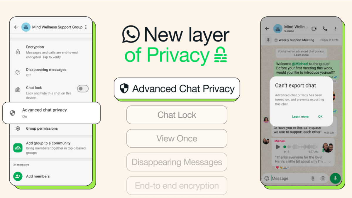 Whatsapp ने एडवांस्ड चैट प्राइवेसी नामक एक नया फीचर लॉन्च किया है, जिसका उद्देश्य यूजर्स को और अधिक प्राइवेसी देना है. इस फीचर को ऑन करने पर क्या-क्या फायदेमंद मिलेंगे, यहां जानें...और ये भी कि ये फीचर क्या नहीं कर सकता है.