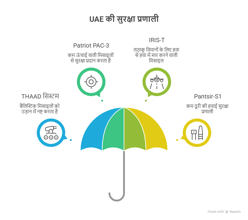 UAE के पास दुनिया की सबसे आधुनिक एयर डिफेंस प्रणालियों में से एक है. इसे मल्टी लेयर यानी कई स्तरों वाली सुरक्षा सिस्टम कहा जाता है. इस सिस्टम में अलग-अलग दूरी और ऊंचाई पर आने वाले खतरे को रोकने के लिए अलग तकनीक का इस्तेमाल होता है. इससे मिसाइल, ड्रोन और अन्य हमलों को समय रहते रोका जा सकता है.