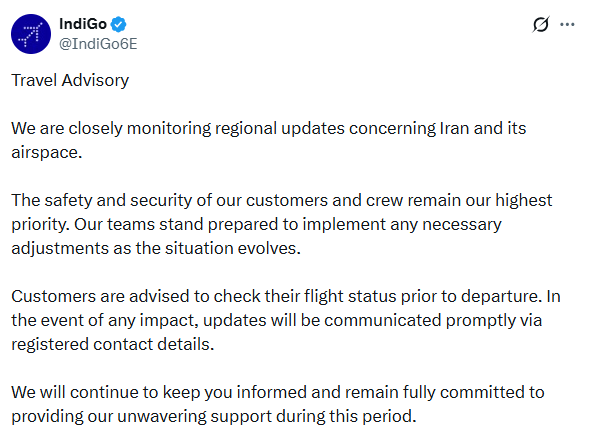 IndiGo ने एक ट्रैवल एडवाइजरी जारी कर बताया कि यात्रियों और क्रू मेंबर्स की सुरक्षा उसकी सबसे बड़ी प्राथमिकता है. एयरलाइन ने कहा कि जैसे-जैसे स्थिति बदल रही है, उसके आंतरिक टीमें किसी भी संभावित परिचालन बदलाव के लिए तैयार हैं. एयरलाइन ने यह भी स्पष्ट किया कि वह ईरान और आसपास के हवाई क्षेत्र से जुड़े अपडेट्स को रियल टाइम में ट्रैक कर रही है, क्योंकि मौजूदा तनाव के कारण एयरस्पेस प्रभावित हुआ है.