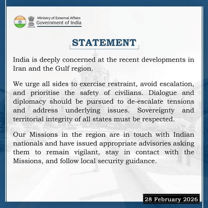 भारत सरकार ने ईरान और खाड़ी क्षेत्र में हाल के घटनाक्रम को लेकर गहरी चिंता जताई है. सरकार का कहना है कि क्षेत्र में तेजी से बदलते हालात चिंताजनक हैं और इन्हें गंभीरता से लेने की जरूरत है. भारत ने सभी पक्षों से संयम बरतने, तनाव को बढ़ने से रोकने और आम नागरिकों की सुरक्षा को प्राथमिकता देने की अपील की है. सरकार ने कहा है कि हालात को शांत करने के लिए संवाद और कूटनीति का रास्ता अपनाया जाना चाहिए, ताकि तनाव कम हो और मूल समस्याओं का समाधान निकल सके. भारत ने यह भी साफ किया है कि सभी देशों की संप्रभुता और क्षेत्रीय अखंडता का सम्मान किया जाना जरूरी है.