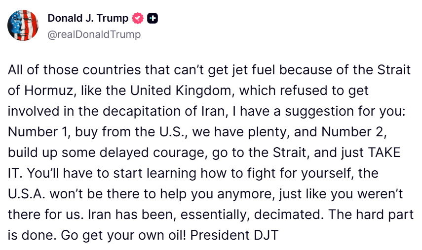 इस दौरान उन्होंने उन सहयोगी देशों पर भी तंज कसा, जिन्होंने युद्ध में शामिल होने की उनकी अपील को ठुकरा दिया था. सोशल मीडिया पर की गई एक पोस्ट में, ट्रंप ने इस व्यवधान से प्रभावित देशों, जिनमें यूनाइटेड किंगडम भी शामिल है – का विशेष रूप से जिक्र किया और इस संघर्ष में शामिल होने के उसके फैसले की आलोचना की.
