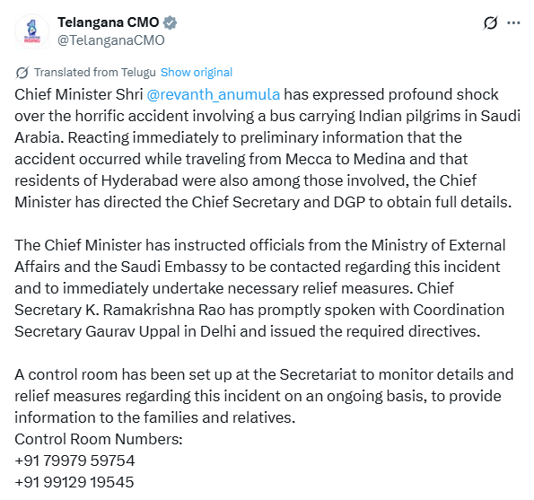 तेलंगाना के मुख्यमंत्री रेवंत रेड्डी ने हादसे पर दुख प्रकट किया. उन्होंने अधिकारियों को पीड़ितों की डिटेल जल्द इकट्ठा करने को कहा. तेलंगाना से कितने यात्री थे यह पता किया जा रहा है. सचिवालय में कंट्रोल रूम बनाया गया. साथ ही 79979 59754 और 99129 19545 हेल्पलाइन नंबर जारी किया है.