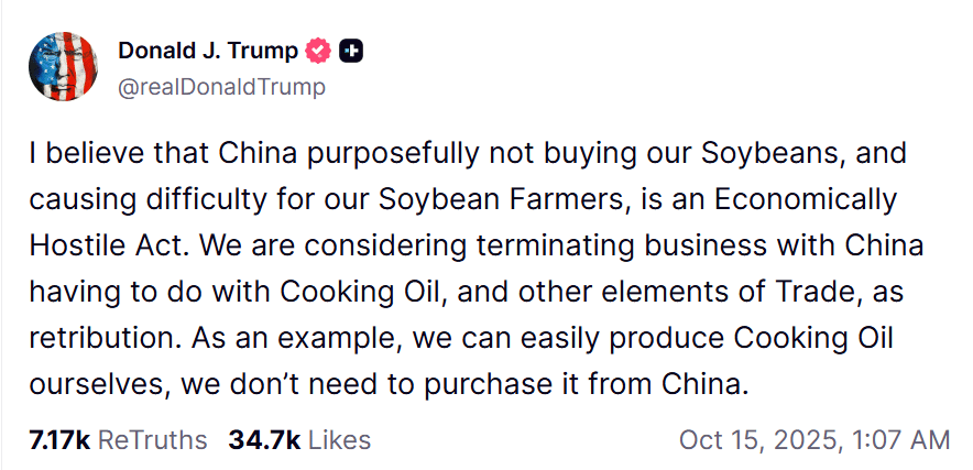 ट्रंप ने कहा कि चीन ने जानबूझकर अमेरिकी किसानों से सोया खरीद बंद की है ताकि दबाव बनाया जा सके. उन्होंने सोशल मीडिया पर लिखा कि यह एक आर्थिक रूप से शत्रुतापूर्ण कदम है और इसके जवाब में अमेरिका चीन के साथ कुकिंग ऑयल समेत अन्य व्यापारिक समझौतों को खत्म करने पर विचार कर रहा है. ट्रंप ने कहा कि अमेरिका खुद तेल बना सकता है उसे चीन से खरीदने की जरूरत नहीं है.