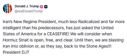 ‘ट्रुथ सोशल’ पर जारी एक बयान में ट्रंप ने दावा किया कि तेहरान के नेतृत्व के लहजे में बदलाव आया है. उन्होंने कहा, ‘ईरान के नए शासन के राष्ट्रपति, जो अपने पूर्ववर्तियों की तुलना में कहीं कम कट्टरपंथी और कहीं अधिक समझदार हैं, ने अभी-अभी संयुक्त राज्य अमेरिका से संघर्ष-विराम का अनुरोध किया है.’