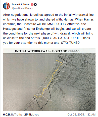 ट्रंप ने अपने सोशल मीडिया प्लेटफॉर्म ट्रुथ सोशल पर कहा कि इजरायल ने उनकी योजना के तहत इनिशियल विड्रॉल लाइन को स्वीकार कर लिया है. इस योजना को हमास के साथ भी साझा किया गया है. हमास की पुष्टि के बाद युद्धविराम तुरंत शुरू होगा और बंधकों व कैदियों की रिहा करने की प्रक्रिया शुरू हो जाएगी. इजरायली प्रधानमंत्री बेंजामिन नेतन्याहू ने उम्मीद जताई कि अगले कुछ दिनों में सभी बंधकों की रिहाई की घोषणा हो सकती है. इसके लिए इजरायल ने मिस्र में होने वाली वार्ता के लिए एक प्रतिनिधिमंडल भेजा है.