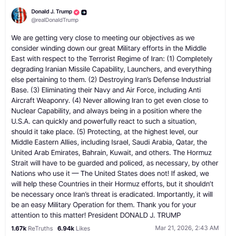 ट्रंप ने कहा कि होर्मुज स्ट्रेट की सुरक्षा अब उन देशों को करनी चाहिए, जो इस रास्ते का इस्तेमाल करते हैं. उन्होंने कहा कि अमेरिका जरूरत पड़ने पर मदद करेगा, लेकिन मुख्य जिम्मेदारी अन्य देशों की होनी चाहिए. हालांकि अमेरिका पीछे हटने की बात कर रहा है, लेकिन इलाके में तनाव अभी भी बना हुआ है. ईरान और इजराइल के बीच हमले जारी हैं. खाड़ी क्षेत्र में तेल और गैस के ठिकानों को निशाना बनाया जा रहा है, जिससे सप्लाई पर खतरा बढ़ गया है.