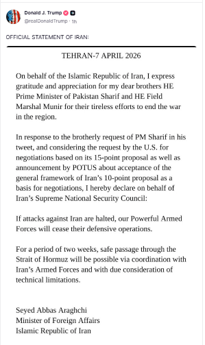 ट्रंप द्वारा शेयर किए गए ईरान के आधिकारिक बयान में कहा गया है कि अगर ईरान पर हमले रोके जाते हैं, तो उसकी सेना भी अपने ऑपरेशन रोक देगी. बयान में यह भी स्पष्ट किया गया कि अगले दो हफ्तों तक होर्मुज स्ट्रेट से सुरक्षित आवाजाही संभव होगी, लेकिन यह ईरानी सेना के समन्वय से होगा.