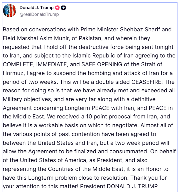 अमेरिकी राष्ट्रपति डोनाल्ड ट्रंप ने अपने पोस्ट में साफ कहा कि उन्होंने पाकिस्तान के नेताओं के साथ बातचीत के बाद “दो हफ्तों के लिए बमबारी रोकने” पर सहमति दी है. उन्होंने इसे “डबल-साइडेड सीजफायर” बताया और कहा कि अमेरिका अपने सैन्य उद्देश्यों को काफी हद तक हासिल कर चुका है.